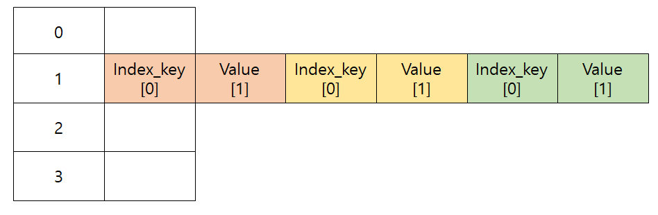 - 개방 해슁 또는 Open Hashing 기법 중 하나 : 충돌하는 데이터에 대해서 추가적인 데이터 공간 (링크드 리스트)에 저장하는 것.