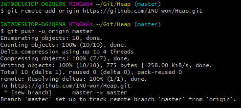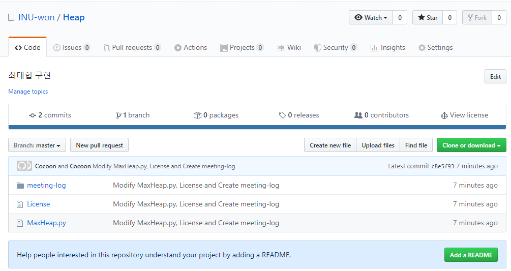 최대 힙 구현 아래 2 commits로 들어가면 지금까지 commit 한 정보를 볼 수 있다.