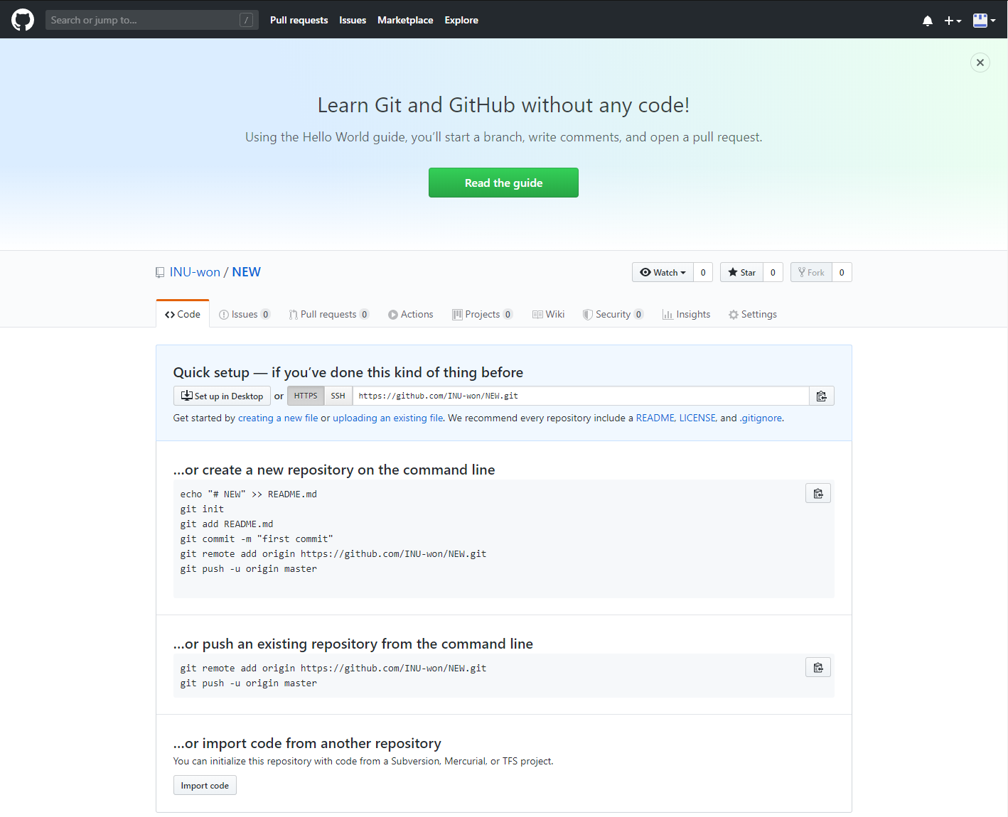 메인화면에 3개의 블록이 있는데 각 단계에 대한 설명이 나와있다. 이미 컴퓨터에 존재하는 레포지토리를 업로드하려면 2번째 블록을 보면 된다. 2개의 줄을 git에 입력을 해주면 git hub에 내 컴퓨터에 있는 레포지토리가 업로드된다.