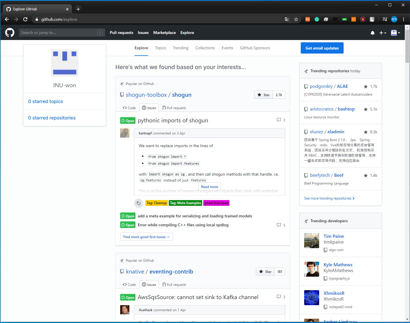 github 사이트에서 상단에 Explore를 클릭하면 다른 사람들의 레포지토리가 나온다. 여기서 레포지토리를 클릭해서 들어가면 된다. 상단 왼쪽 검색창에 프로젝트 이름을 검색한 후 들어가도 된다.
