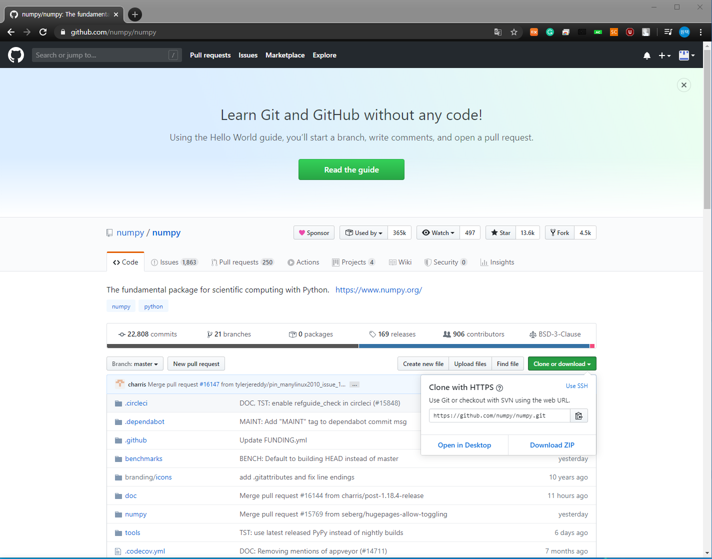 레포지토리를 다운받으려면 먼저 주소를 알아야 한다. 여기서 다른 사람의 레포지토리를 들어간 후 Clone or download를 클릭하면 주소를 볼 수 있다.
