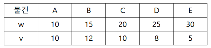 - 무게 제한이 k인 배닝에 최대 가치를 가지도록 물건을 넣는 문제