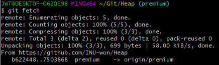 - 이때 'git fetch'명령어를 이용하면 리모트 레포지토리의 데이터를 로컬 레포지토리에 가져온다.