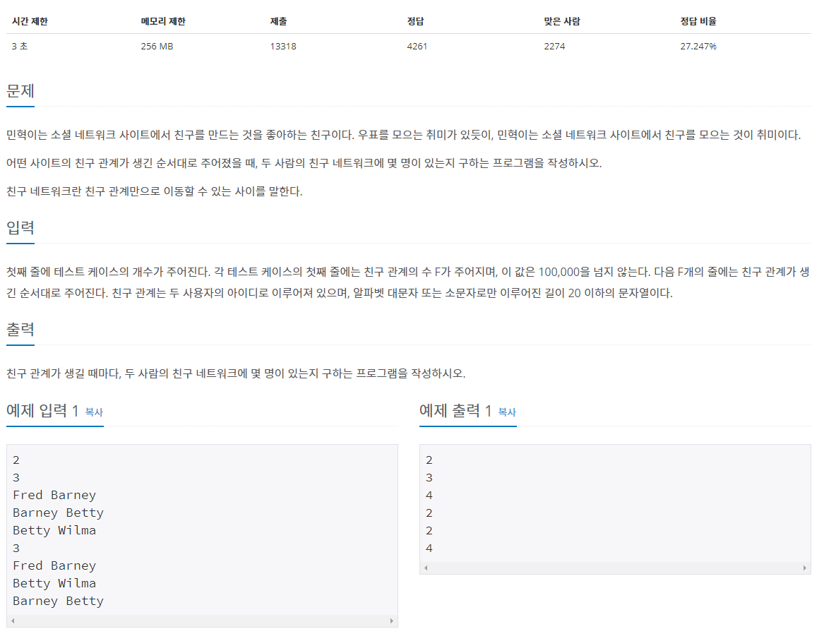 문제 민혁이는 소셜 네트워크 사이트에서 친구를 만드는 것을 좋아하는 친구이다. 우표를 모으는 취미가 있듯이, 민혁이는 소셜 네트워크 사이트에서 친구를 모으는 것이 취미이다. 어떤 사이