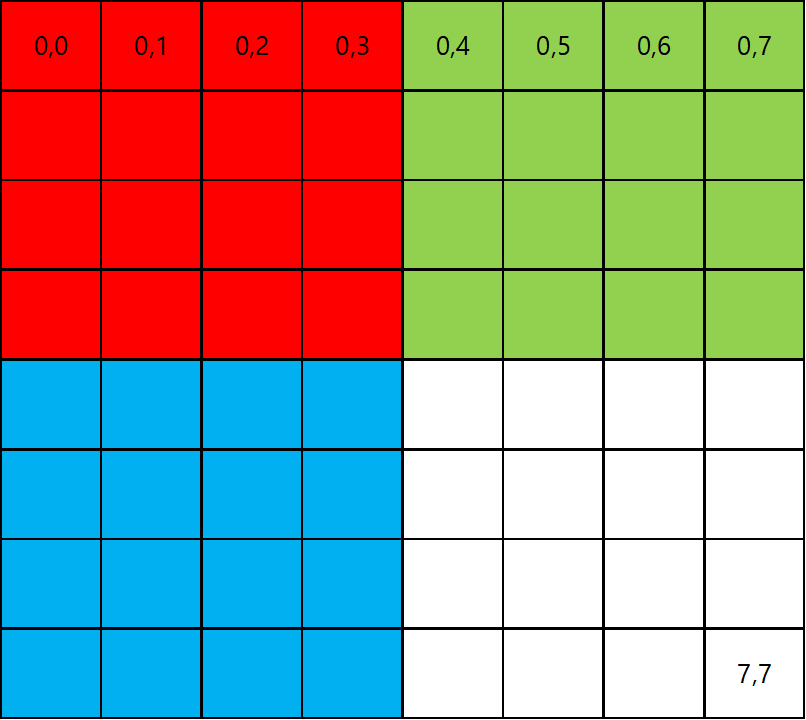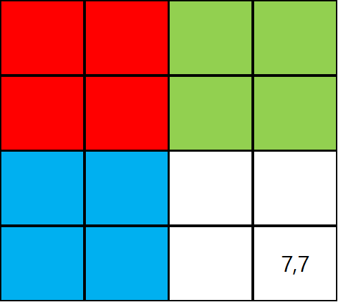 - n = 3에서 (7,7)을 찾을 때 1) 빨간색 영역, 2) 초록색 영역, 3) 파란색 영역에 해당하지 않으므로 각 영역의 사각형 수를 방문 횟수에 누적