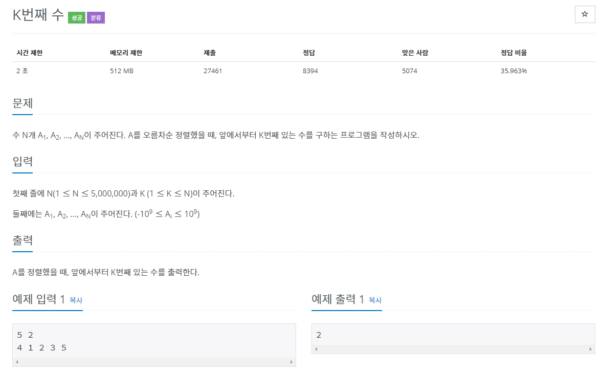 수 N개 A1, A2, ..., AN이 주어진다. A를 오름차순 정렬했을 때, 앞에서부터 K번째 있는 수를 구하는 프로그램을 작성하시오.