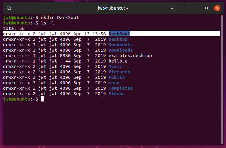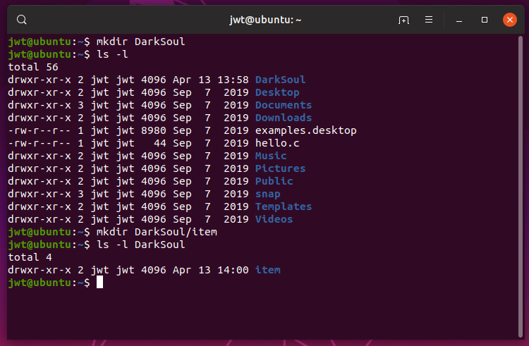 현재 디렉토리에 DarkSoul 디렉토리를 생성하였다. DarkSoul 디렉토리 안에 item 디렉토리를 만들기 위해서는 DarkSoul 디렉토리로 이동할 필요는 없고 경로를 써주면 된다.