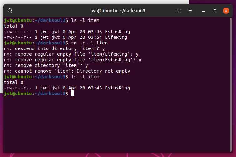 -i옵션을 써주면 디렉토리로 이동할 것인지 물어본다. y를 입력하면 디렉토리 내부로 이동하게 되고 내부에 있는 파일 하나하나에 대해서 삭제할 것인지 물어본다. y를 입력하면 삭제를 하고 n을 입력하면 삭제하지 않는다. 마지막으로 디렉토리를 삭제할 것인지 묻는데 y나 n 어느 것을 입력해도 상관없다. 내부에 파일이 남아있으면 디렉토리는 삭제가 안되기 때문이다.
